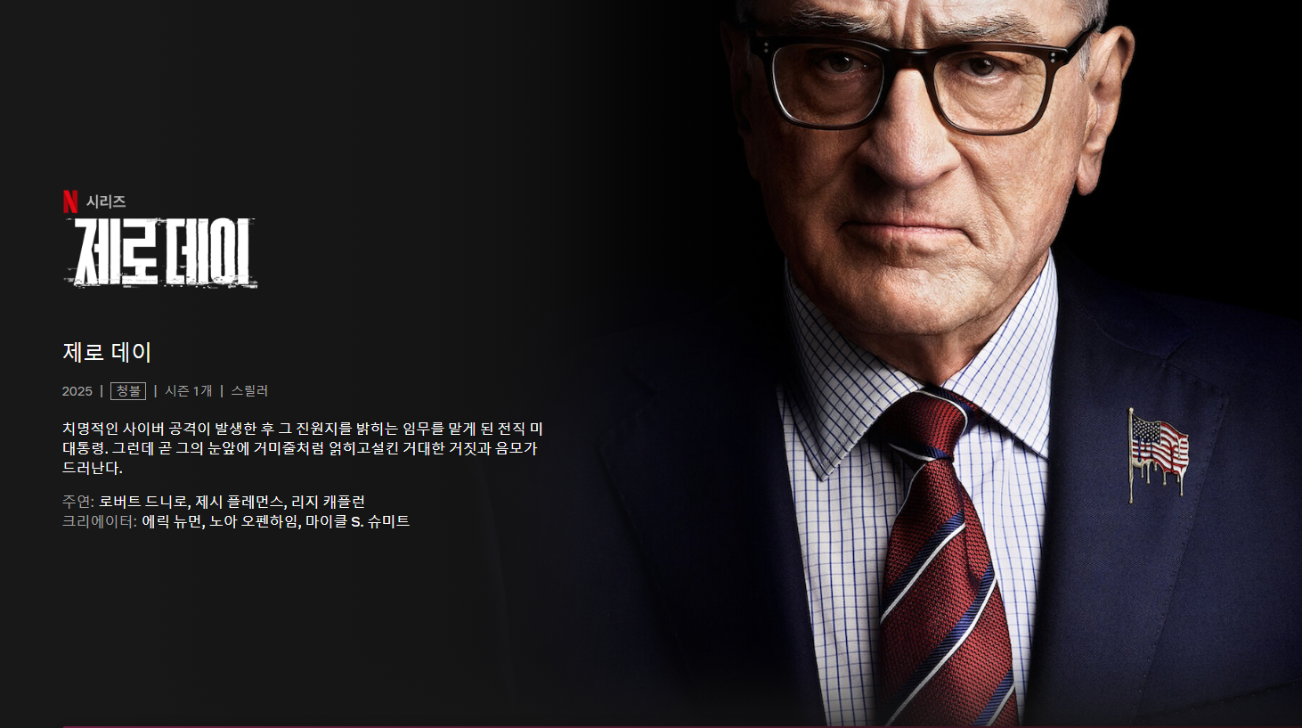 넷플릭스에서 새롭게 선보이는 정치 스릴러 '제로데이(Zero Day)'가 드디어 공개되었습니다. 이 작품은 거대한 음모와 국가적 위기 속에서 전직 대통령이 돌아와 진실을 파헤치는 긴장감 넘치는 이야기를 담고 있습니다. 특히, 로버트 드 니로가 주연을 맡으며 화제를 모았고, 그의 첫 TV 시리즈 도전작이라는 점에서 더욱 기대를 높이고 있습니다.